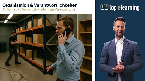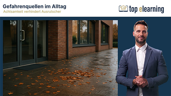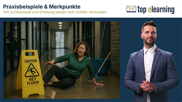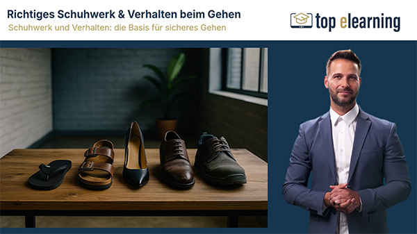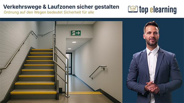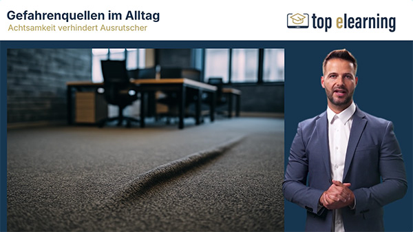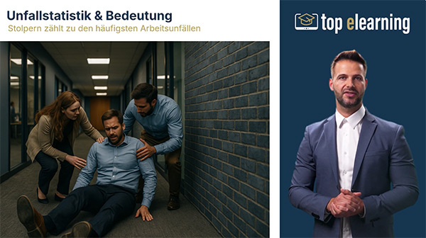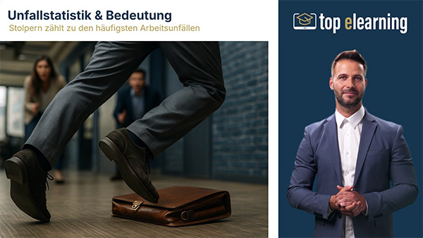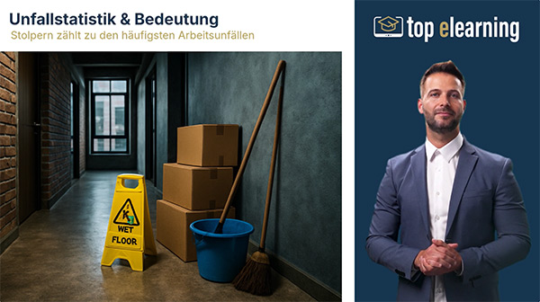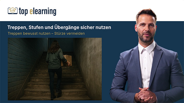Die Online-Unterweisung „Sicher gehen bei der Arbeit“ zeigt auf, wie Stolper-, Rutsch- und Sturzunfälle im Arbeitsalltag wirksam vermieden werden können.
