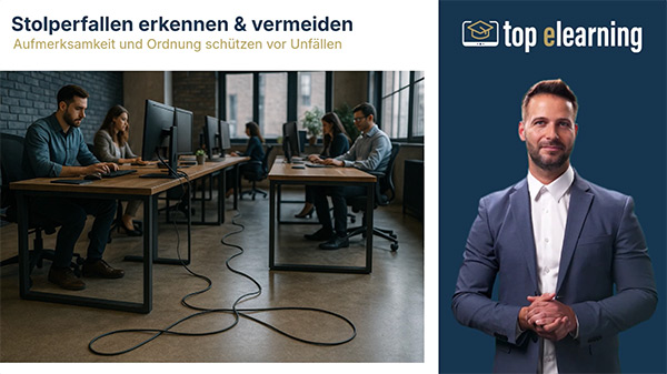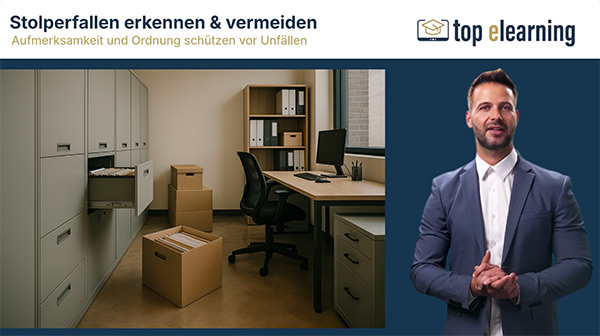 Diese Unfälle zählen zu den häufigsten Ursachen für Verletzungen am Arbeitsplatz – oft durch Kleinigkeiten wie Kabel, nasse Böden oder offene Schubladen. Der Kurs sensibilisiert für typische Gefahrenquellen im Büro und auf Verkehrswegen, vermittelt wichtige Verhaltensregeln und erklärt, welche Maßnahmen zur Vermeidung beitragen – von der richtigen Kennzeichnung bis zum passenden Schuhwerk.